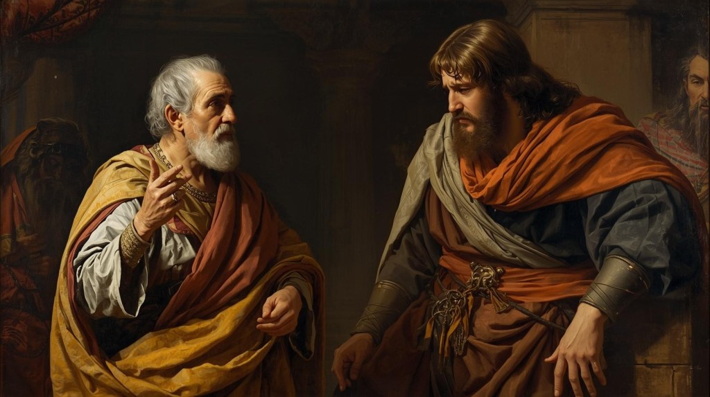 • Tafsiran & Aplikasi: Saul, sebaliknya, dikelilingi oleh rasa takut dan paranoid. Dia tidak memiliki penasihat sejati yang berani mengatakan kebenaran. Daud, meski melalui banyak penderitaan, membangun komunitas yang setia berdasarkan kepercayaan dan pelayanan.